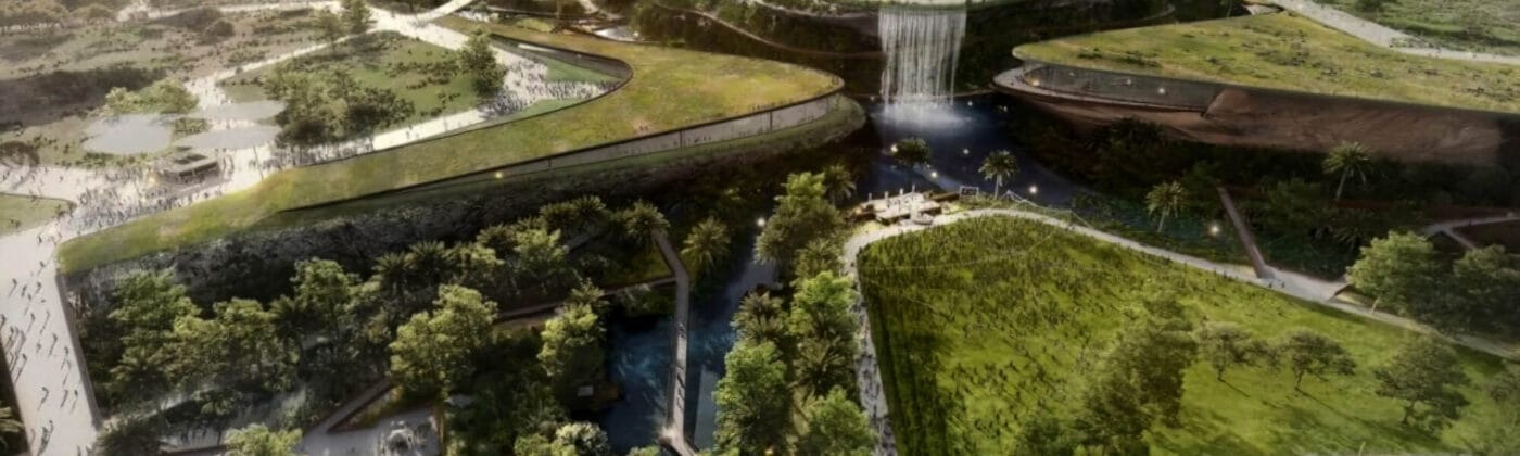 Le cœur du site est structuré autour d’un cours d’eau central, métaphore de vie et d’adaptation au climat désertique. Cinq zones thématiques en forme de pétales s’articulent autour de cette rivière, reliées entre elles par des ponts favorisant les mobilités douces. Cette structure symbolise l’équilibre recherché entre l’humain, la technologie et la nature – fidèle au thème central de l’événement « L’Ère du changement : ensemble pour un avenir prévoyant ».