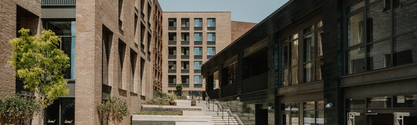 La silhouette de Mason & Fifth Westbourne Park est l’œuvre du prestigieux cabinet londonien Allford Hall Monaghan Morris (AHMM). S’élevant sur 12 étages, ce nouvel emblème architectural dialogue avec son environnement. Son design rend un hommage contemporain au passé industriel du quartier, tout en s’inspirant de la nature environnante. Les façades sont un jeu de textures audacieux, mêlant brique robuste, acier poli et tuiles de terre cuite vernissées d’un vert profond qui font écho aux reflets du canal.