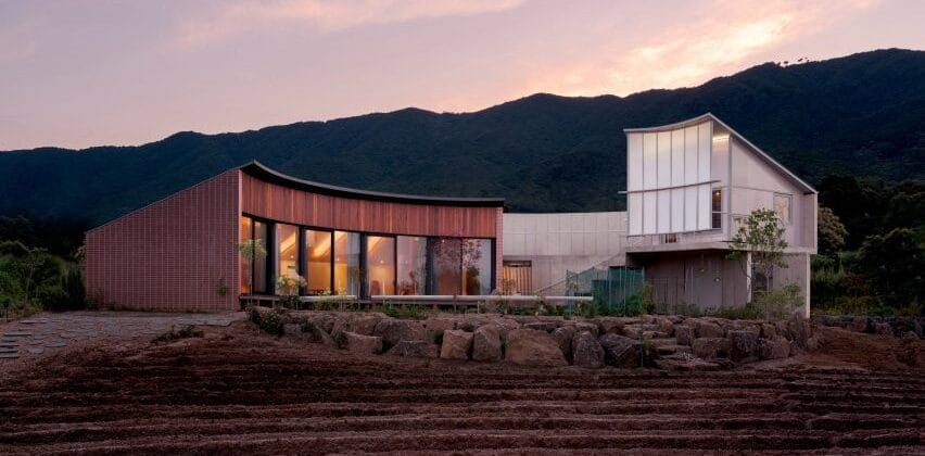 À l’intérieur, le volume en briques accueille les espaces de vie essentiels : séjour, cuisine ouverte, salle à manger, ainsi qu’une chambre principale orientée plein sud. De l’autre côté, on trouve l’entrée, la buanderie et les pièces sanitaires. Un banc en brique rouge court le long des baies vitrées, offrant un lieu de repos paisible face aux plantations. À l’étage, un second espace plus compact intègre une chambre d’amis. Ce cocon en béton et polycarbonate translucide crée une lumière chaude la nuit, semblable à une lanterne flottante dans le paysage.