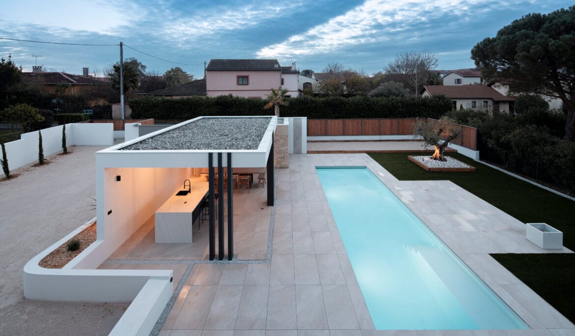 INFORMATIONS SUR LE PROJET Type de construction : Neuve Programme : Accès et clôture, terrain de pétanque, pool house, couloir de nage Budget travaux : 205 000 euros HT Date de livraison : Novembre 2025 Surface projet : 500m² Localisation : Escalquens Maitre d’ouvrage : Privé Photographe : Alexandre Le…