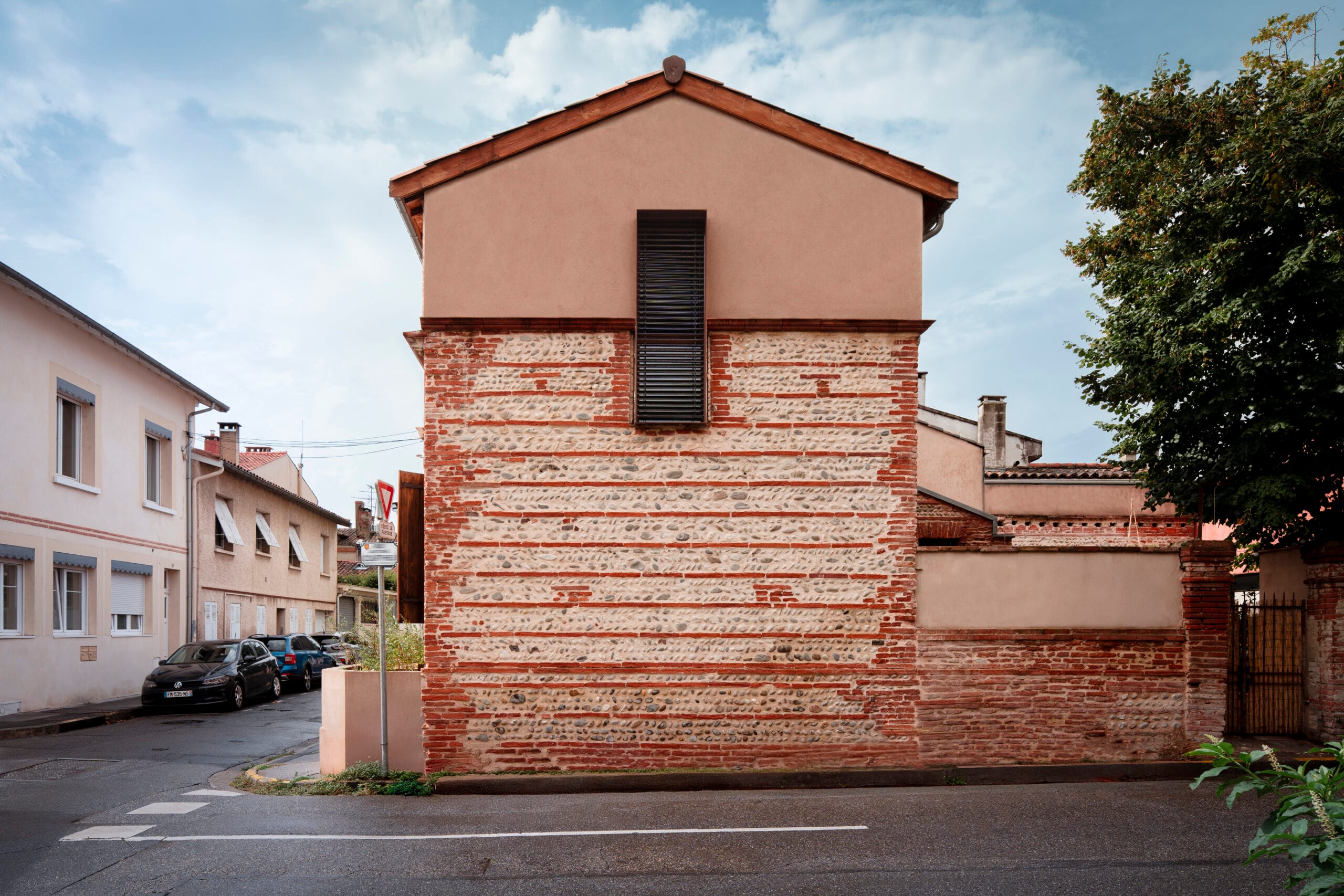Le pignon conserve son ouverture unique, prolongée de manière à s’inscrire sur les deux parties – ancienne et neuve – comme un point d’articulation.
